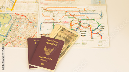 Passport and Japanese banknote on blur subway map