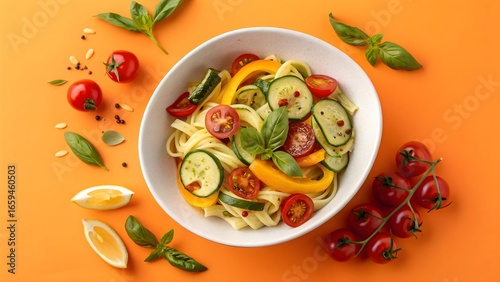 Pasta Primavera with Tomatoes and Zucchini in Orange Background