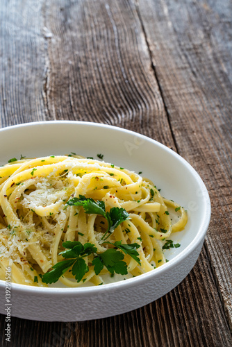 Pasta with garlic and parsley on wooden table. Spaghetti aglio olio on wooden background