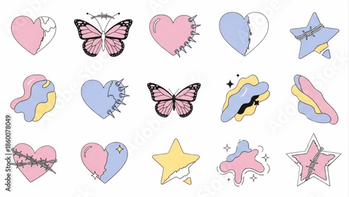 Pastel Aesthetic Design Elements with Hearts, Stars, and Butterflies