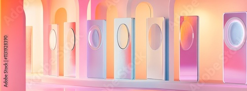 abstract, arch, archway, pastel, pink, orange, light, gradient, modern, minimalist, contemporary, interior, architecture, geometric, shape, circle, wall, smooth, soft, bright, vibrant, three-dimensional, render, studio, scene, display, product, showcase