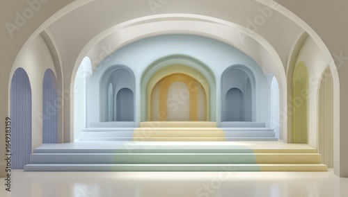 arch, pastel, interior, scene, geometric, minimalist, modern, empty, light, colours, soft, space, studio, three-dimensional, design, render, calm, elegant, bright, symmetric, structured, simple, clean, colourful, neutral, beige, blue, yellow, green, step, platform, pattern, multi, level, archway, room, abstract, showcase, display