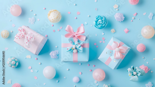 Pastel Celebration: Gift Boxes, Balloons, and Confetti on a Blue Background