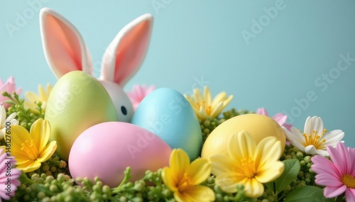Pastel colored Easter eggs nestled in a spring flower arrangement, bunny ears peeking out from behind , pastel, holiday, joyful