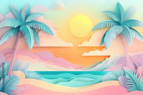 Pastel colored paper cut-out scene of a tropical beach at sunset.