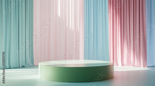 dais, display, room, pastel, colours, lighting, background, modern, minimal, product, empty, exhibition, interior, design, presentation, studio, showcase, scene, smooth, surface, green, light, pink, blue, texture, curtain, empty space, soft, simple, elegant, clean, minimalist, show, three-dimensional, mock-up, render