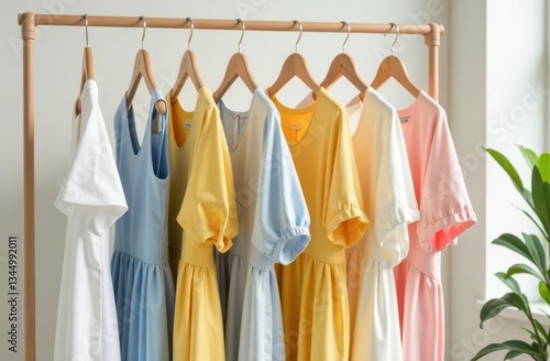 dress, dress, fashion, summer, pastel, sustainable, clothing, retail, style, trend, hanger, wooden, rack, clothes rack, boutique, shop, store, garment, apparel, colours, colourful, design, display, sale, consumerism, minimalism
