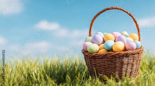 Pastel Eggs in a Basket on a Green Lawn Under a Bright Sky