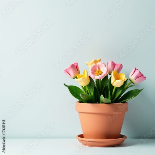 Pastel flowers in a delicate terra cotta planter against a pale sky, plant arrangement, small flowers