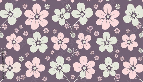 Pastel Pink and Green Floral Seamless Pattern on Purple Background: Delicate Flower Design for Textile, Fabric, Wallpaper, and Surface Applications