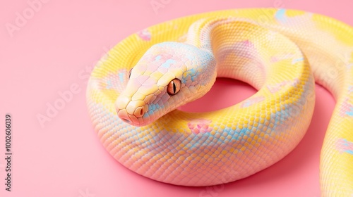snake, python, reptile, pastel, colours, pink, yellow, blue, scale, animal, pet, exotic, wildlife, nature, fauna, closeup, macro, pattern, texture, background, soft, beautiful, cute, eye, head, body, curve, coiled, snake, serpentine, slither, reptilian, skin, bright, high-coloured, vibrant, colourful, photo