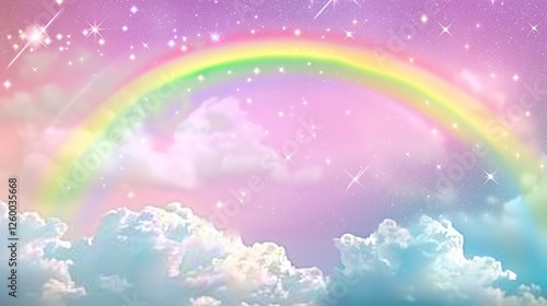 Pastel Rainbow Sky with White Clouds and Stars Over Pink Background, Fantasy Landscape Illustration, Heavenly Dreamy Romantic Scene with Detailed Soft Colors and Beautiful Lighting