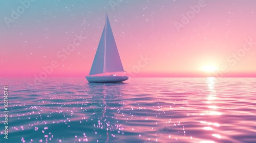 pastel, sailboat, sunset, ocean, water, pink, sunrise, sky, boat, voyage, sail, calm, peaceful, dreamy, sea, horizon, light, sun, sparkle, glistering, magic, fantasy, art, digital, three-dimensional, illustration, romantic, beautiful, colours, vibrant, texture, smooth, motion, gentle, tranquil, adventure, freedom, escape, serene, bliss, harmony, floating, glowing, whimsical, soft