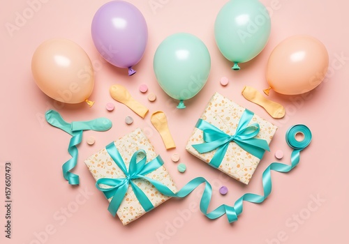 Pastel-colored balloons and wrapped gifts arranged on a light pink surface, creating a festive scene.