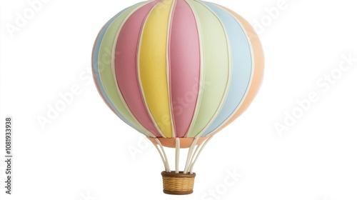 balloon, hot, air, pastel, colours, pink, yellow, green, blue, striped, wicker, basket, fabric, white, background, isolated, round, shape, flying, sky, travel, adventure, dream, whimsical, cute, decoration, ornament, vintage, retro, classic, childhood, joy, happiness, light, airy, delicate, soft, gentle