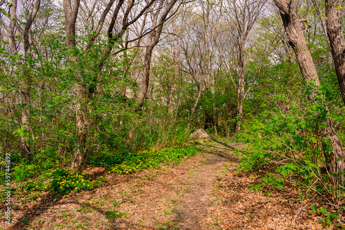 Path among yellow flowers in the forest. Chylomecon. Endemic of the Far East. It occurs wild in East Asia: in the far east of Russia; in Korea, northeast China, and the Japanese islands.