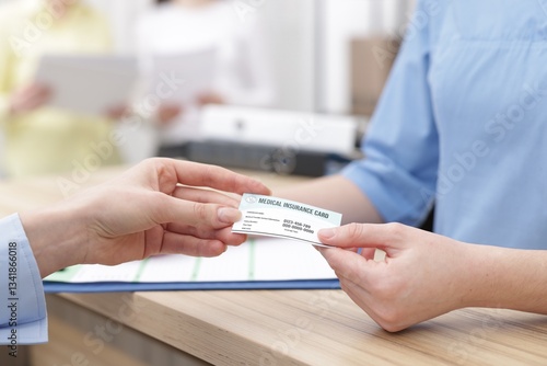 Patient giving medical insurance card to receptionist at wooden counter in clinic, closeup