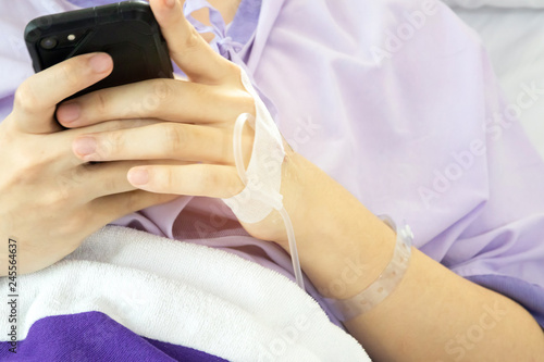Patient hold smartphone in his hand. Never stop to using mobile phone. Social networking addiction.