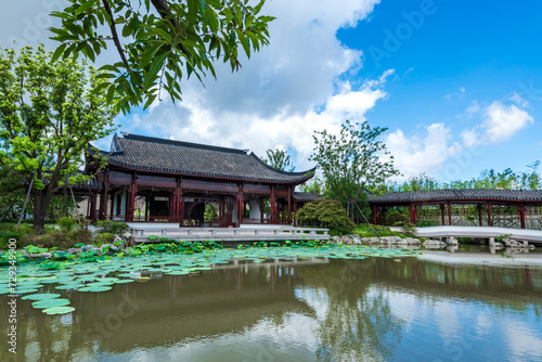 architecture, garden, water, lake, china, park, asia, building, duck pond, house, palace, traditional, pavilion, sky, tree, river, nature, oriental, japan, temple, landscape, travel, culture, bridge