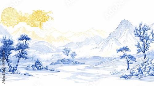 landscape, mountain, tree, nature, blue, art, painting, chinese, design, winter, view, peaceful, tradition, beauty, style, illustration, background, decor, home, artistic, minimalist, contemporary, aesthetic, colours, drawing, vignetting, digital, texture, still life, wallpaper, modern