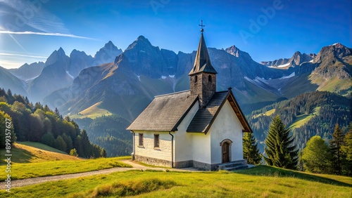 Peaceful church nestled in the mountains with a backdrop of stunning landscape and clear blue sky , Church, mountains