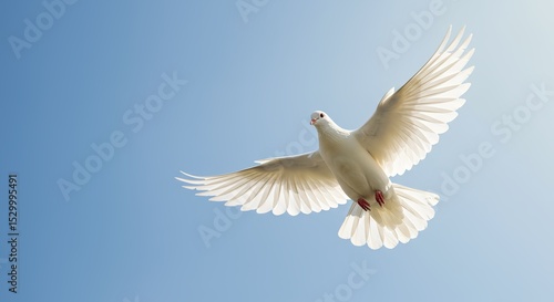 Peaceful Dove in Flight - Graceful White Bird Soaring Against Clear Blue Sky with Sunlit Feathers AI-Generated