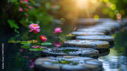 garden, stone, water, lily, sunlight, flower, nature, peace, calmness, path, bliss, flora, beauty, heaven, foliage, texture, landscape, pink, well-being, ambient, blossom, sublime, shade, bathe, radiance, vibrant, retreat, rainbow, gentle, pleasure, charme, view, pathway, wellness, lead, freshness, climate, sunbeam