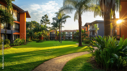 Peaceful Green Space in the Heart of an African City with Expansive Lawns, Tall Palm Trees, and Walking Trails Illuminated by Warm African Sunlight, Framed by Sleek Modern Apartments