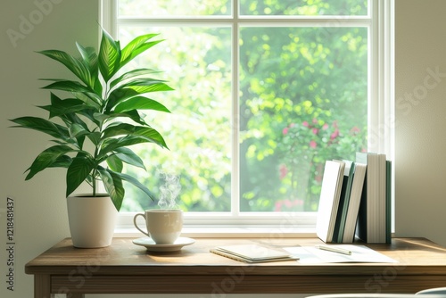 plant, houseplant, hot drink, cup, book, desk, window, sunlight, green, leaf, workspace, home, office, morning, calm, peaceful, tranquil, serene, relaxing, natural, light, indoor, plant, potted, supply, notebook, wooden, cosy, comfort, still, life, decor, interior, design, bright, fresh, clean, minimal, simple, aesthetic, lifestyle, work, from, study, reading, tea, warmth, white, table