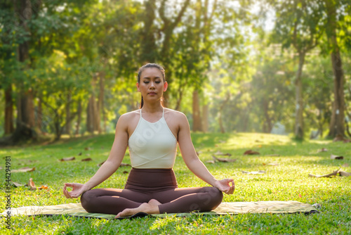 Peaceful millennial woman meditating with eyes closed at outdoor surrounded by beautiful nature..