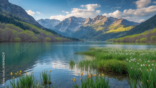 Peaceful mountain lake landscape with reflections of snow-capped peaks and green forests under a clear sky