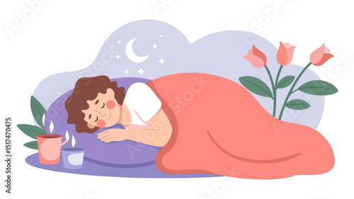 Peaceful night sleep with scented candles and flowers promoting relaxation and well being, featuring a woman sleeping soundly under a blanket with a transparent background
