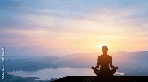 Peaceful silhouette of a person meditating in lotus pose on a mountain peak, overlooking a serene sunrise landscape with rolling hills and a lake, ...