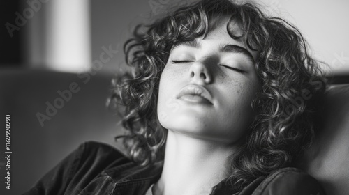 Peaceful sleeping woman with closed eyes, enjoying a quiet moment.