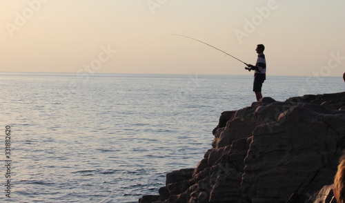 Pêcheur sur un rocher au dessus de la mer