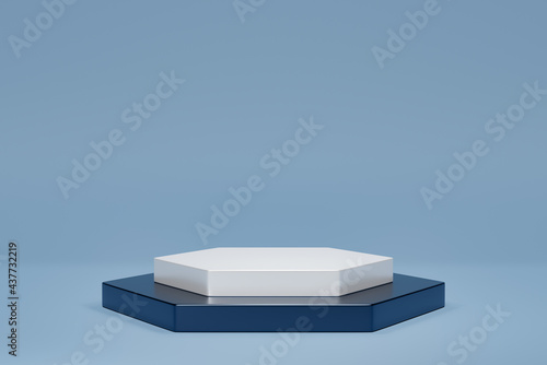 Pedestal hexagon empty on blue background. 3D rendering podium for product demonstration.