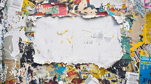 Peeling layers of old posters on wall, creating textured space for artistic expression or ads