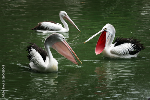 Pelican Timor or Pelecanus Conspicillatus or Australian Pelican in a zoo, a group of pelicans swimming around looking for food with their friends