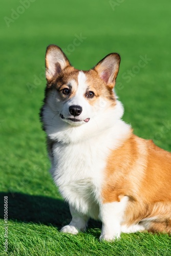 Pembroke Welsh Corgi puppy walks on a sunny day in a clearing with green grass. Sits and looks at the camera. Happy little dog. Concept of care, animal life, health, show, dog breed