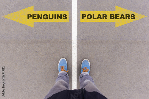 penguin, polar, bear, north, south, pole, region, direction, choice, decision, text, arrow, line, left, right, difference, side, word, term, letter, asphalt, concrete, floor, ground, foot, lettering, bottom, shoe, grey, personal, perspective, individual