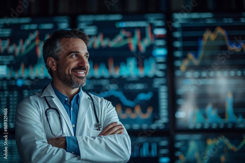 Pensive doctor smiles looking away with arms crossed in front of screens displaying healthcare statistics and graphs