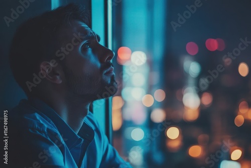 man, window, city landscape, worry, lighting, night, contemplation, thought, emotion, bokeh, atmosphere, solitude, portrait, urban, sharpened, deep, expression, nightscape, blues, dreaming, longing, gaze, scene, moment, melancholy, skyline, distance, inspiration, creativity, introspection, quiet, calm, lost, city, background, beauty, character, serious, alone, anxious, hope, feeling, looking, view, people