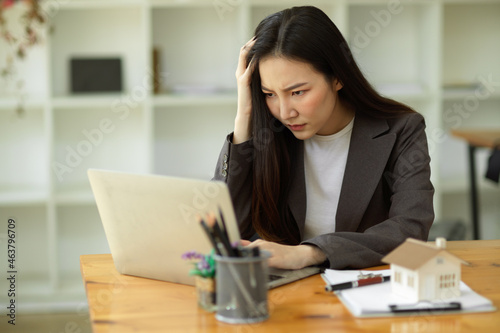 Pensive, Thoughtful, Serious, Ponder young asian businesswoman working on her laptop