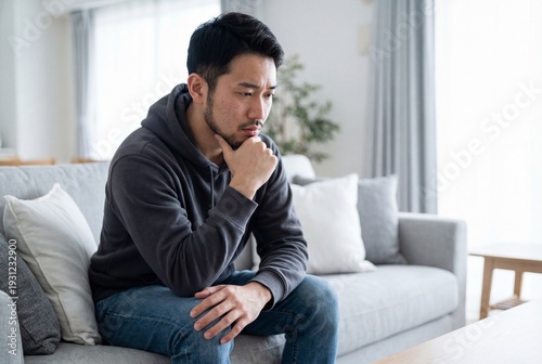 pensive, contemplative, serious, focused, man, asian, male, adult, young, beard, hoodie, sitting, couch, living room, home, thinking, indoor, lifestyle, solitude, alone, thoughtful, worried, concerned, casual attire, modern, apartment, indoor, person, guy, young men, casual clothes, concentration, mental health, worry, concern, stress, considering
