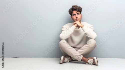 pensive, young, man, sitting, white, wall, thoughtful, casual attire, sweater, khaki, sneaker, contemplation, alone, solitude, pondering, indoor, male, adult, floor, space, empty, background, light, copy, modern, lifestyle, reflective, neutral, colours, serene, expression, facial, hand, clasped, daydreaming, serious, quiet, mindfulness, introspective, attire, fashion, simple, clean, design, resting, minimalist, youth