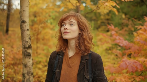 woman, autumn, forest, leaf, red, hair, curly, pensive, nature, outdoors, fall, yellow, orange, brown, sweater, jacket, tree, bush, soft, light, natural, portrait, young, looking, up, calm, peaceful, serene, contemplative, thoughtful, beautiful, pretty, attractive, upward, gaze, backlit, gold, hours, vibrant, colours, foliage, timberland, scene, setting, sunlight, sunbeam, path, solitude