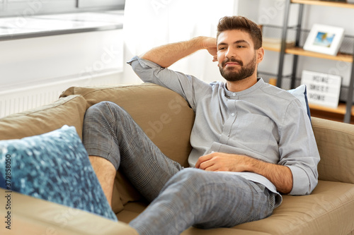 man, home, sofa, rest, comfort, sitting, leisure, people, male, person, lifestyle, couch, young, concept, indoor, adult, living room, beard, hispanic, serious