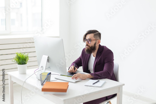 editor, man, working, graphic, design, computer, photogenic, artist, desk, office, tablet, professional, technology, creativity, designer, work, digital, tool, draw, young, pen, illustrator, monitor, stylus, adult, drawing, indoor, human, skill, job, designing, screen, using, digitize, sitting, studio, white, background, beard, 20s, 30s, european, goggles, table, purple, jacket, indoor, flower