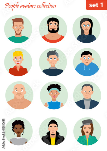 People avatar collection. Different nationalities, clothes and hair styles. Cute and simple flat cartoon style.