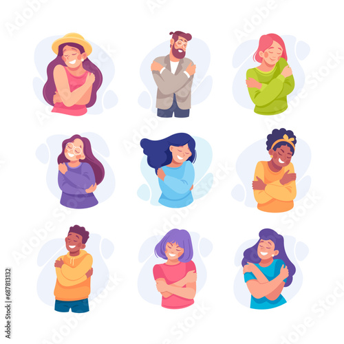 People Hug Themselves Taking Care and Show Importance of Oneself Vector Set